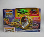 An oversized Skelesaurus and 1:64 scale Bone Shaker face off in a race to avoid destruction! Release the two vehicles with the power switch and see if Bone Shaker can beat out the evil foe as they speed down a hill toward a massive loop. A randomizer selects one of two outcomes: Bone Shaker makes it through the loop and escapes to safety while Skelesaurus gets left in the dust, or Skelesaurus catches its prey, trapping Bone Shaker in the loop, knocking it over. Set includes two crushed cars for extra destruction. Colors and decorations may vary.