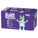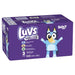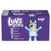 Introducing Luvs Platinum Protection diapers featuring Bluey! Luvs disposable diapers have up to 12-hours of Triple Leakguard Protection, but our leak protection doesn't stop there, the secure cuffs and stretchy sides help keep leaks locked in where they happen the most.Feel the softness and bring a new level of comfort for baby's delicate skin. Parenting can be stressful. Rest assured with worry-free Luvs Diapers and give your baby the gentle comfort he/she needs with the name brand protection that parents trust.With Luvs Platinum Protection diapers you know when they go, thanks to a wetness indicator that turns blue on contact with wetness. Plus, meet our best friend, Bluey. These adorably fun patterns give our diapers an added layer of cuteness to match your baby. Here are the highlights:Four levels of protection: Triple Leakguards, wetness indicator, secure and stretchy sides, comfy leak barrier cuffsMax softness: Soft and comfy for your baby's delicate skinIt's not a mystery that babies are pretty delicate, so these diapers are dermatologically tested, hypoallergenic, and free of parabens and latex.*Any fuss? Trust us with our money back guarantee. We think you'll be wondering how you ever got by without these baby diapers, but if you're not loving Luvs for any reason, we'll send you a refund**. Luvs Platinum Protection Baby Diapers are available in sizes N-8. Size newborn (<10 lb), size 1 (8-14lb), size 2 (12-18 lb), size 3 (16-28 lb), size 4 (22-37 lb), size 5 (27+ lb), size 6 (35+ lb), and size 7 (41+ lb), size 8 (46+ lb).*Natural rubber. **If you're not completely satisfied, please send the original receipt and UPC to us within 45 days of purchase for a full product refund via prepaid card. Limited to one redemption per household or name. For additional details, please call 1-888-665-3257.