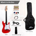Get rocking with the Pyle Beginner Electric Guitar Kit, model PEGKT15R. This comprehensive kit includes everything you need to start playing guitar. The double-cutaway, solid-body guitar is constructed from high-quality basswood for the body, rosewood for the fretboard, and maple for the neck, delivering a rich, clear tone. The high gloss red finish adds a stylish touch.