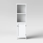 Keep your bathroom neat and organized with this Wood Linen Tower from Threshold™. This tall linen tower with a slim profile provides an attractive storage solution in any bathroom with limited space. Made from a sturdy wood frame, it ensures a durable finish for long-term-use. This practical piece features an inset door cabinet on the bottom for concealed storage and two open shelves to display decorative accents or often-used bath items. Place this piece against your empty bathroom wall space to create extra storage in smart space-saving style.
