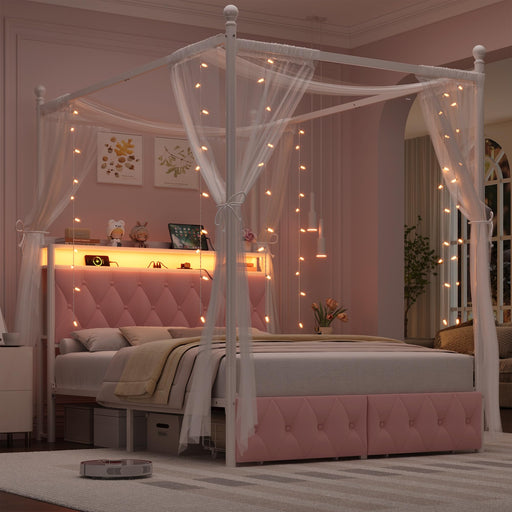 View full detailsHIFIT Queen Size Upholstered LED Canopy Bed Frame With Storage And Charging Station, Button Tufted Storage Headboard With Bookshelf, Two-Use Metal Platform Bed With 4 Removable Posts & 2 Drawers, Pink (LOCAL PICKUP ONLY)