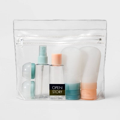 Open StoryMake all your travels convenient with this 7-Piece Toiletry Bag Set from Open Story™. This clear toiletry set includes a bottle, a spray bottle, tw...