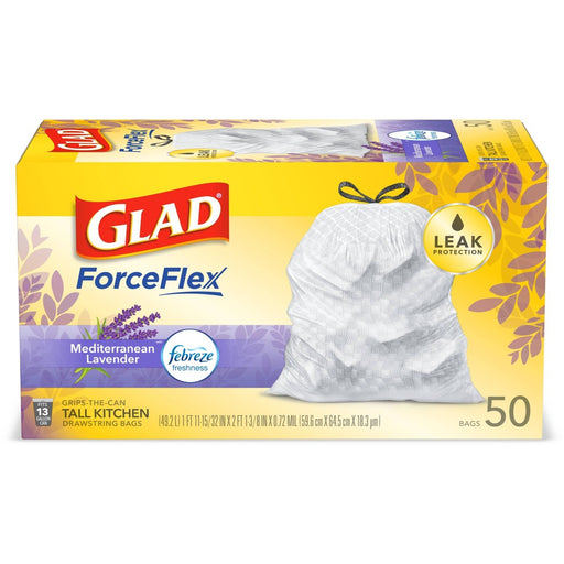 View full detailsGlad ForceFlex + Tall Kitchen Drawstring White Trash Bags - Mediterranean Lavender Scent with Febreze Freshness - 13 Gallon - 50ct