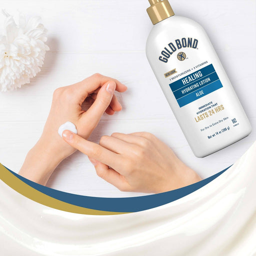 Gold BondHydrate and nourish dry skin for a full 24 hours with Gold Bond Healing Hydrating Lotion. This daily moisturizer with aloe has a fresh, clean scent...