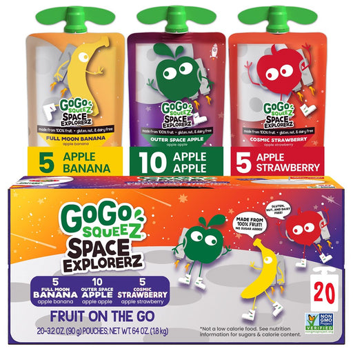 View full detailsGogo Squeez Fruit On The Go Space Explorerz Variety Pack, Banana, Apple, Strawberry, 3.2 Oz (Pack Of 20), Unsweetened Fruit Snacks For Kids, No Gluten, Nut & Dairy, Recloseable Cap, BPA Free Pouches