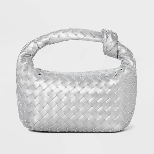 A New DayThis Mini Woven Handbag Clutch from A New Day™ in silver showcases an unstructured silhouette with a woven-textured construction and a knot detail....