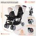 Sometimes kids just can't sit still, so give them the option of sitting, standing, or sleeping in this convertible double stroller. This stroller features a parent tray with cup holders to keep your phone, keys, and drink within reach. It also includes a large storage basket under the seat for holding everything you need for a busy day.