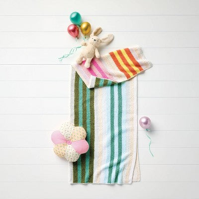 PillowfortMake your kid's room extra cozy with the Stripe Knit Throw Blanket from Pillowfort™. This throw blanket features colorful stripes on a white backdr...
