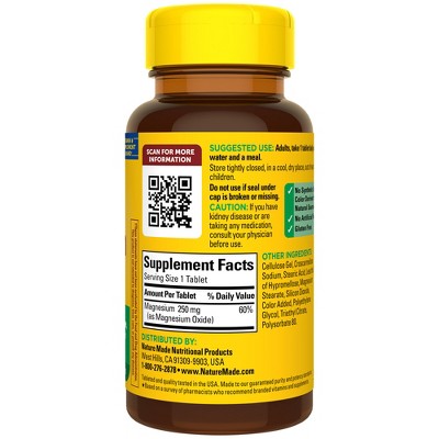 Nature MadeThese Nature Made Magnesium Oxide 250 mg Tablets are dietary supplements designed to support muscle relaxation, heart health, bone health and nerve...