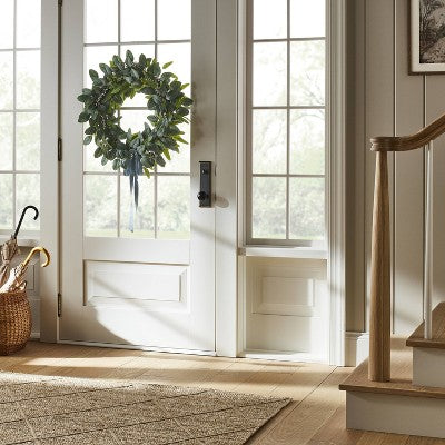 View full details26" Eucalyptus Wreath with Ribbon Green - Artificial, Indoor Use, Unlit - Threshold designed with Studio McGee