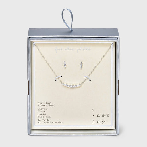 View full detailsSilver Plated Cubic Zirconia Curved Bar with Stud Earring Station Necklace - A New Day™ Silver