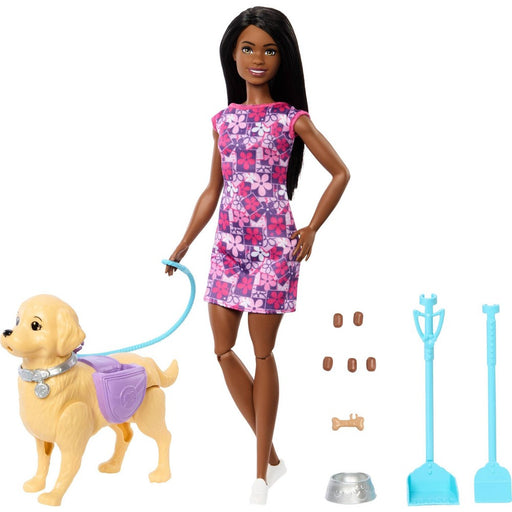 BarbieHelp Barbie 'Brooklyn' doll walk her dog through the Big City and clean up after it goes potty! Wind the knob on the toy dog and pull back the leas...