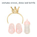 Step into a world of enchantment with the BABY born Princess Baby Doll, where elegance meets imagination. She's ready for magical adventures and fairy tale dreams. Perfect for every little royal at heart! She is dressed in a an off-white satin bodice dress with sparkling pink skirt. Her glasslike slippers have molded-in glitter and her hair is topped with a golden crown with diamond-shaped cutouts. Pretend feed her with the included bottle or lay her down for bedtime and her eyes will close. For over 30 years, BABY born has been the trusted name in nurturing dolls, encouraging empathy and imaginative play with their inclusive, realistic, and premium-quality designs. Includes baby doll, dress, shoes, crown and bottle. Perfect for girls and boys ages 3 years old and up. Available in 3 different skin tones and eye colors.