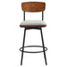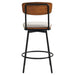 The stunning mixed-material look adds contrast and visual interest to your aesthetic. 360-degree swivel maximizes comfort and convenience. With a simple spin, you can enjoy the conversation from every angle, making this set of the perfect seating choice for kitchens and entertaining spaces. Built for comfort, this set feature a padded seat, wood-finish backrest, and metal footrest. The high-density foam seat pad creates a cozy seating experience and features easy-to-clean upholstery. Handcrafted by artisans, the sleek, durable base is constructed of metal and hand-painted in a solid black finish. A 27-inch seat height is ideal for counter-height kitchen islands and tables. Sit comfortably and enjoy an informal happy hour or a quick meal with this wood and metal swivel counter stool set. An ideal blend of style and function, this Claire Wood and Metal Counter Stool brings extra seating and contemporary style to any kitchen island, pub table, or home bar This bar stool piece adds both style and function.