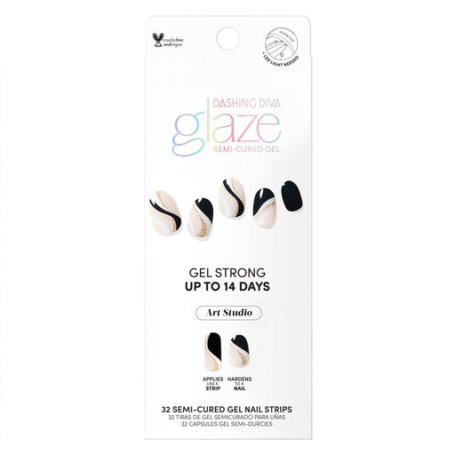 Dashing DivaThe real fun begins at midnight... Semi-cured sheer nude gel nail strips featuring black & white abstract waves and gold glitter with mega volu...