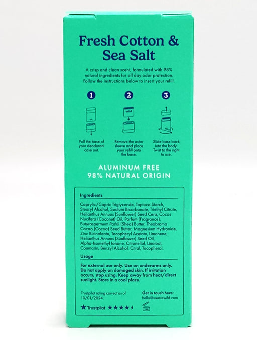Wild CosmeticsWild Refillable Deodorant Starter Pack, with Black Case + Fresh Cotton & Sea Salt refill.Refillable deodorant, powered by nature. Wild deo is p...