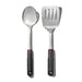 The OXO Stainless Steel Turner and Spoon Set gives you the right tools for everyday cooking and serving. The Turner’s durable, beveled head easily slides under burgers, pancakes, eggs, fish, and more, while elongated slots let liquids drain quickly. The Spoon is perfectly sized for stirring, blending, scooping, and serving a variety of recipes. Both feature sleek stainless steel heads that transition seamlessly from kitchen to table, and soft, non-slip handles that stay comfortable and secure in hand, even when wet. With built-in hanging holes for convenient storage and dishwasher-safe construction for easy cleanup.