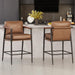 Mid-Century Modern Barstool: This barstool blends a sleek metal frame with a sling-style seat, embodying a minimalist yet rustic mid-century style. Straightforward square footrest warm-toned wooden armrests and thick soft cushions provide exceptional comfort and lasting durability., Built To Last Counter Stools: The sturdy matte black metal frame ensures durability and the solid rubber wood armrests exude a natural charm. Each leg comes with a felt pad to protect your floor. Weight capacity: 300 lbs. Seat cushion is padded with dense foam and topped with a soft blend of fiber to offer supreme comfort. The loose cushions provide a customized level of comfort, allowing you to arrange them to your liking., Easy To Clean Faux Leather: Lightly moisten a cloth with water and wipe clean easily. The durable faux leather has the look of real leather and provides butter-soft texture. Formaldehyde is not detected in our faux leather., Set of 2. Overall dimension: 24.4''D x 21.5''W x 39.4''H. Seat Dimension: 16.7''D x 18.5''W x 27.2''H., Comfortable Medium Firm Seat: On a scale from 1 to 5 (5 being firmest), it's a 3., Exceptional Customer Support: This counter-height bar stool includes clear instructions and all necessary tools for easy assembly. If you have any questions, please get in touch with our professional customer support team, and we’ll provide a satisfactory solution.