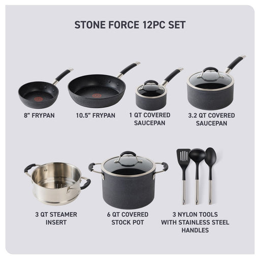 Experience T-fal revolutionary Stone Force 12 piece pots and pans cookware set. Featuring our advanced Platinum Non-Stick cookware, our longest las...