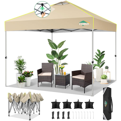 View full detailsCOBIZI 10X10 Pop Up Canopy Tent Without Removable Sidewalls, One Push Party Tent Outdoor Waterproof Event Canopy With Air Vent For Parties Commercial Wedding, 3 Height, Carry Bag, Sandbag, Khaki (LOCAL PICKUP ONLY)