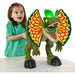 Young Jurassic World fans can relive epic movie moments, and imagine new stories of their own, with this extra-large Imaginext Thrash Attack Dilophosaurus dinosaur toy from Fisher-Price. Kids control all the ferocious action of this dinosaur, which roars to life with awesome lights, sounds, expanding frills, and projectile-launching “spitting” action—just like in the films! Standing over 16 inches tall, this Dilophosaurus dinosaur towers over her prey and inspires big-time Jurassic World imaginative play for preschoolers. Requires 3 AA batteries, included.