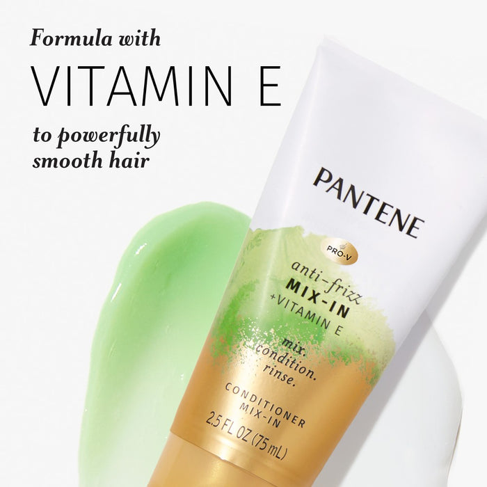 FIGHT FRIZZ, SMOOTH STRANDSTired of fighting flyaways? Give it a boost and powerfully smooth frizzy hair from root to tip with the Pantene Pro-V Anti-Frizz Conditioner Mix-In formulated with a blend of hydrating ingredients, including vitamin e. This Mix-In works seamlessly with any conditioner to radically enhance your hair's hydration, leaving you with your softest locks yet even during the hot, humid summer months. You can powerfully smooth down even the most stubborn frizz and silken strands from root to tip. Pantene Conditioner Mix-Ins give your hair what it needs, when it needs it. This Mix-In is ideal for all hair types, including straight, wavy, curly, and coily strands. No matter your hair texture, you can have soft, hydrated locks. After just one use, you'll see a visibly beautiful difference. Your best hair day is in the palm of your hands!HOW TO USE In your hand, simply add a small amount of Pantene Anti Frizz Mix-In to any conditioner. Then, blend together. Condition as you would normally, leaving the product in your hair for a couple of minutes for best results. Rinse thoroughly and style as needed. Don't limit yourself to just one treatment. Add any additional Mix-Ins to your routine for a customized experience every time you step foot into the shower.