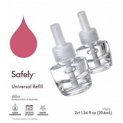 Create the perfect upscale scent experience without the upscale prices! Safely Scent Diffuser Universal Refills are made with essential oils and fine fragrances for the ultimate scent experience. Each refill gives your home up to 100 days of scent-sational fragrance bliss. Our fragrance plug-ins feature an adjustable cap that offers a precise adjustment of scent strength so you can control how much you want to enjoy at one time. Our formula is gentle and created to showcase our Bliss Scent.