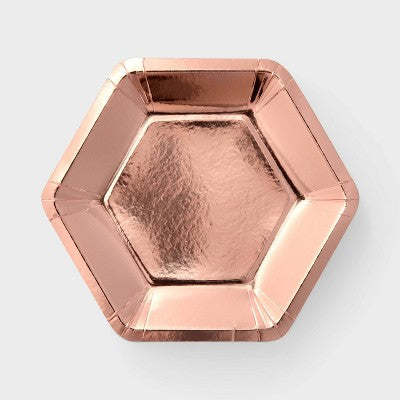SpritzServe your delicious snacks, treats and desserts using the 50ct Rose Gold Dinner Plates - Spritz™. These hexagon-shaped plates are not only visuall...