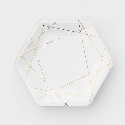 SpritzServe your delicious snacks, treats and desserts using the 50ct Gold/White Snack Plates - Spritz™. These hexagon-shaped plates are not only visuall...