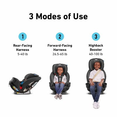GracoThe Graco SlimFit 3-in-1 Car Seat grows with your child, from rear-facing harness (5-40 lb) to forward-facing harness (26.5-65 lb) to highback boos...