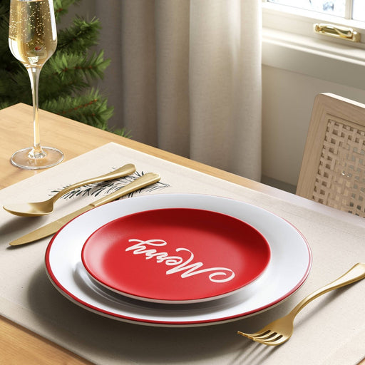 ThresholdSpread festive vibes over your dinner table with the 7-Inch Melamine Merry Salad Plate from Threshold™. This red salad plate features the text "Mer...