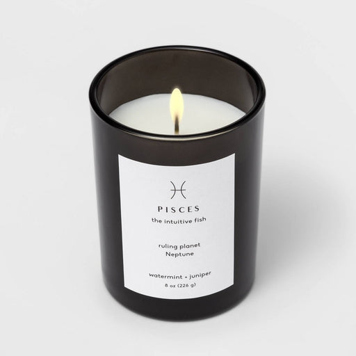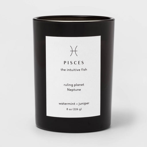 View full details8oz Glass Jar Zodiac Pisces Candle Black - Threshold: Soy & Paraffin Wax, 36hr Burn Time, Juniper Mint Scent