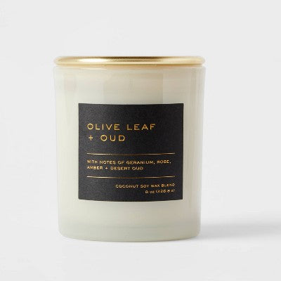 View full details8oz Lidded Glass Jar Black Label Olive Leaf and Oud Candle - Threshold: Soy & Coconut Wax Blend, 30hr Burn Time