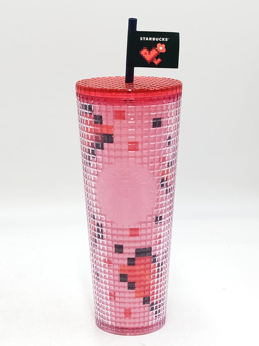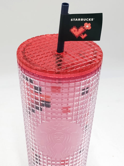 StarbucksValentine’s Day Grid Plastic Cold Cup – 24 fl oz Textured Double-wall Plastic, Tinted lid, liner and outer, Artwork printed on foil, Embossed Sire...