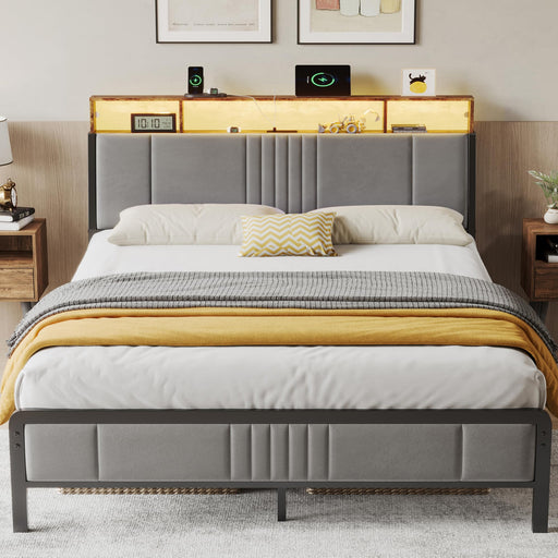 Bedspick Queen Bed Frame With Ergonomic Headboard, Upholstered Metal Platform Bed Queen Size With 2-Tier Storage, Charging Station, Smart LED Lights, Easy Assembly, No Box Spring Needed, Gray (LOCAL PICKUP ONLY)