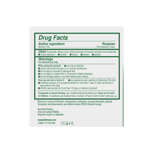 BiofreezeBiofreeze Menthol Pain Relieving Cream with natural moisturizers is well-suited for application on small and large muscle areas. Fast acting and lo...