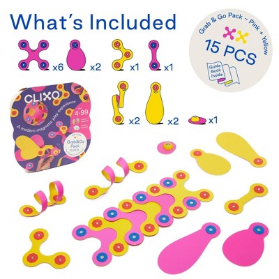 With 15 pieces in 7 different shapes, and a quick start guide, this Grab & Go pack is the perfect pack to bring the fun anywhere! Clixo is crea...