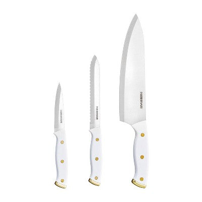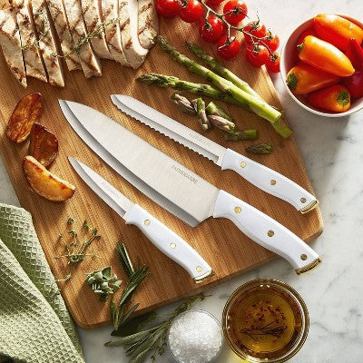 View full detailsFarberware 3pc Knife Set White/Gold: Chef, Paring & Utility Knives, Stainless Steel Blades, Riveted ABS Handles