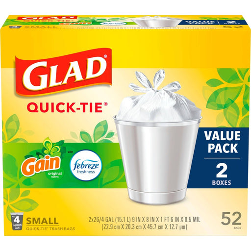 View full detailsGlad Small Quick Tie Trash Bags - Gain Original - 4 Gallon/52ct