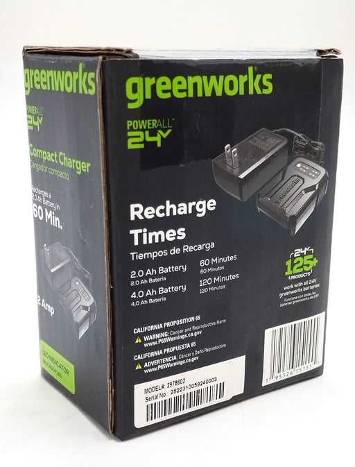 GreenworksGreenworks 24V 2A Charger AdaptorDimensions (Overall): 4.45 Inches (H) x 2.19 Inches (W) x 3.5 Inches (D)Weight: .5 PoundsAssembly Details: No Asse...