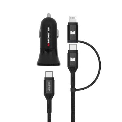 Monster 35W Dual Port 6' Long Cable Car Charger Bundle 1 USB-C and 1 USB-A Port