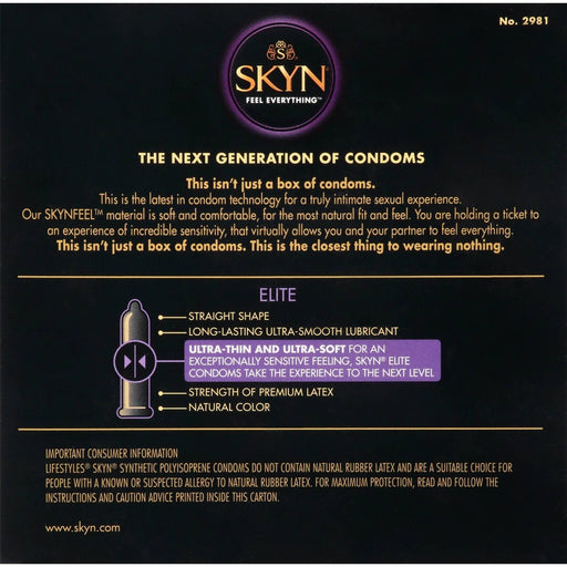 SKYNEXP:02/2030SKYN Elite Ultra Thin Premium Polyisoprene Lubricated Condoms are made with SKYNFEEL, a non-latex material that feels soft and natural. ...