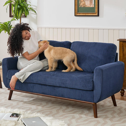 Tbfit Corduroy Couch For Living Room, Mid Century Modern Sofa With Spring Cusions For Bedroom,Comfy Upholstered Couches Easy Assembly With Solid Wood Legs & 2 Pillows (Blue, 65Inch) (LOCAL PICKUP ONLY)