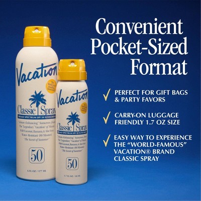VacationTake your sunscreen experience to new heights of convenience with Vacation Classic Spray SPF 50 Mini - 1.7 fl oz – a clean, lightweight sunscreen s...