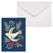 These holiday cards feature a white dove surrounded by foliage and berries set against a navy background. The cards include a "Peace on Earth" exterior sentiment and "Wishing you all the blessings of the season." interior sentiment.