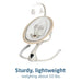 Swing smartly in style with the Cassia Swing designed to give you freedom and flexibility while comforting your little one. The optional automatic motion detector senses when your infant needs extra soothing and activates the swing. Its built-in touch screen panel allows you to select from 5 swing speeds, plus 12 melodies and nature sounds to keep baby relaxed and entertained. The 360° rotation helps you both feel connected and engaged. At only about 10 lbs., the Cassia swing is easy to transport and folds compactly when you want to tuck it away. Key to the design is the use of EcoCare, our new premium, future-friendly, 100%-recycled fabric made from plastic bottles. The yarn produced is soft, comfortable, and breathable––perfect for your little one.Innovative and lightweight, this swing also features a sophisticated, modern color palette intended to blend beautifully with your décor. Cassia was made to bring tranquility into a busy day by providing soothing comfort for baby plus convenience for you, and ultimately enhance your quality time at home. For babies up to 20 lbs.Never let babies sleep in rockers, bouncers, or swings.