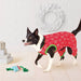 Accessorize your four-legged friend for Christmas with the Santa Dog and Cat Pajama from Wondershop™. These red pet pajamas feature an allover print of Santa's face and stars in white along with green leg openings for a festive look. Made of stretchy polyester, they feature a convenient pullover design and can be washed by hand after use.